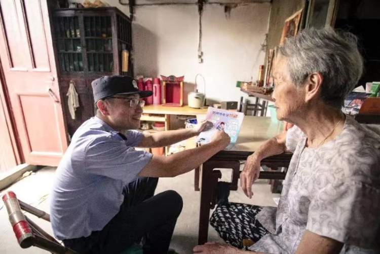 在大桥派出所,所长毛威宙带领102位民警一起加入到入户宣传这支突击队当中。“你猜我几岁啦?”8月23日下午,一位95岁独居老人问上门走访的毛威宙。毛威宙了解到,95岁高龄的老太太依然精神抖擞,只是听力衰退了不少,平时没有上网和使用手机的习惯,每周几个女儿会定期前来看望。