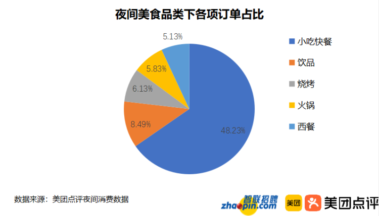 美团平台上的夜间订单显示,美食品类下小吃快餐订单占比为48.23%,饮品为8.49%,烧烤为6.13%,火锅为5.83%。西餐为5.13%。小龙虾更是在白领的夜宵选择中占比12%。