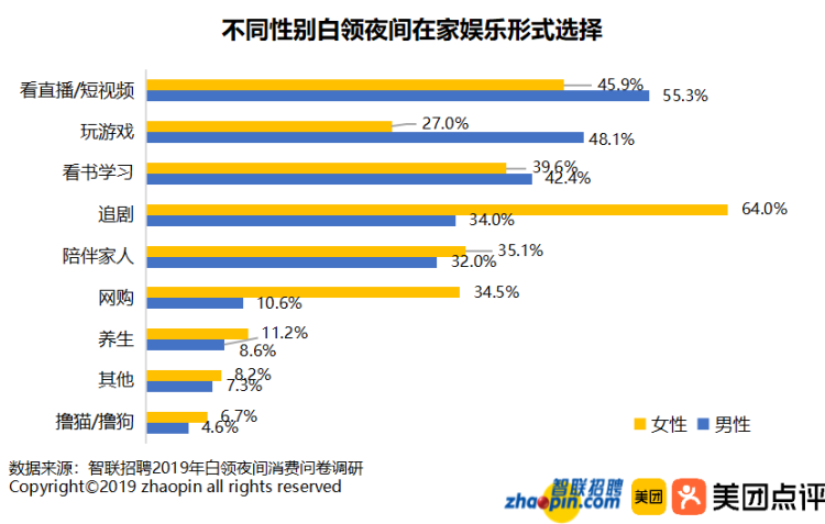 近日,智联招聘与美团点评合作撰写了《2019年中国白领夜间消费调研报告》。