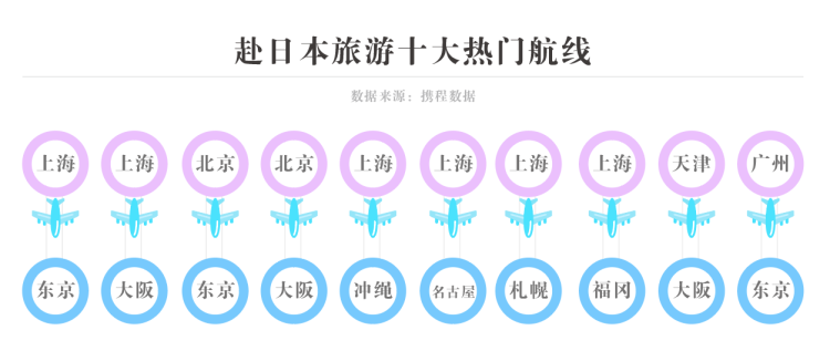 2019年1月至7月,上海至东京、上海至大阪、北京至东京、北京至大阪、上海至冲绳、上海至名古屋、上海至札幌、上海至福冈、天津至大阪、广州至东京是人气最旺的十大热门航线。