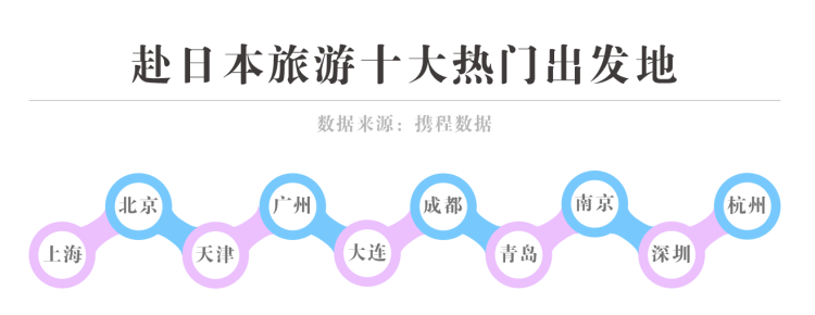 哪些城市的居民最爱去日本打卡?携程大数据显示,今年1月至7月,上海、北京、天津、广州、大连、成都、青岛、南京、深圳、杭州等地是赴日本旅游的十大热门出发地。