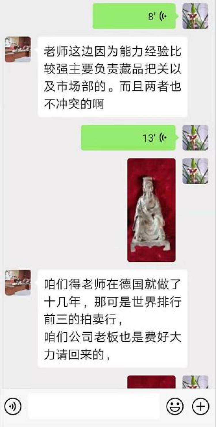 家住安徽马鞍山的李女士,在2018年底和2019年初花了三十万元买了三件藏品,打算今年3月份出手,于是在网上找到了这家“拍卖公司”,抱着试试看的态度将这三件藏品拍了照片,传到了网上留的电子邮箱,没想到,很快“业务员”庄某就打电话过来,并互加了微信,商量拍卖事宜。