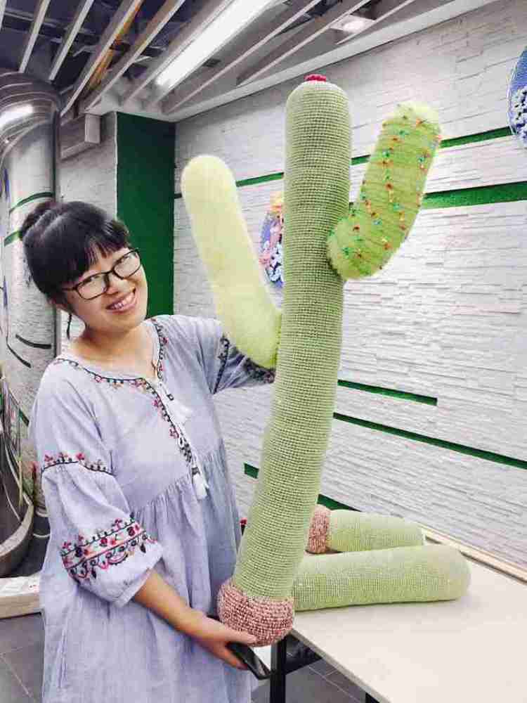 就拿1米多高的仙人掌来说,做工十分考究,是用两股毛线绞在一起编织而成,其中一股带着小小的亮片,这也使得从远处看仙人掌的成品,仿佛自带闪光。“沙漠中烈日当空,这种小闪片正是营造阳光的效果。”从毛晚的作品中,你不难看到她对细节的追求。