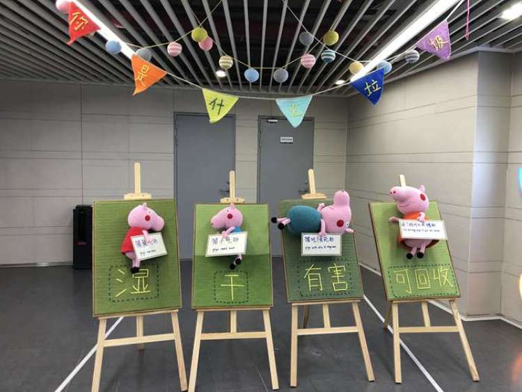 而最受孩子们欢迎的粉红猪小妹一家,则变成了垃圾分类的宣传大使。按照猪可以吃、猪不可以吃、猪吃了会死等等,毛晚将猪小妹一家四口分别对应干垃圾、湿垃圾、可回收垃圾和有害垃圾,放在了锦绣坊地下一层的醒目处。