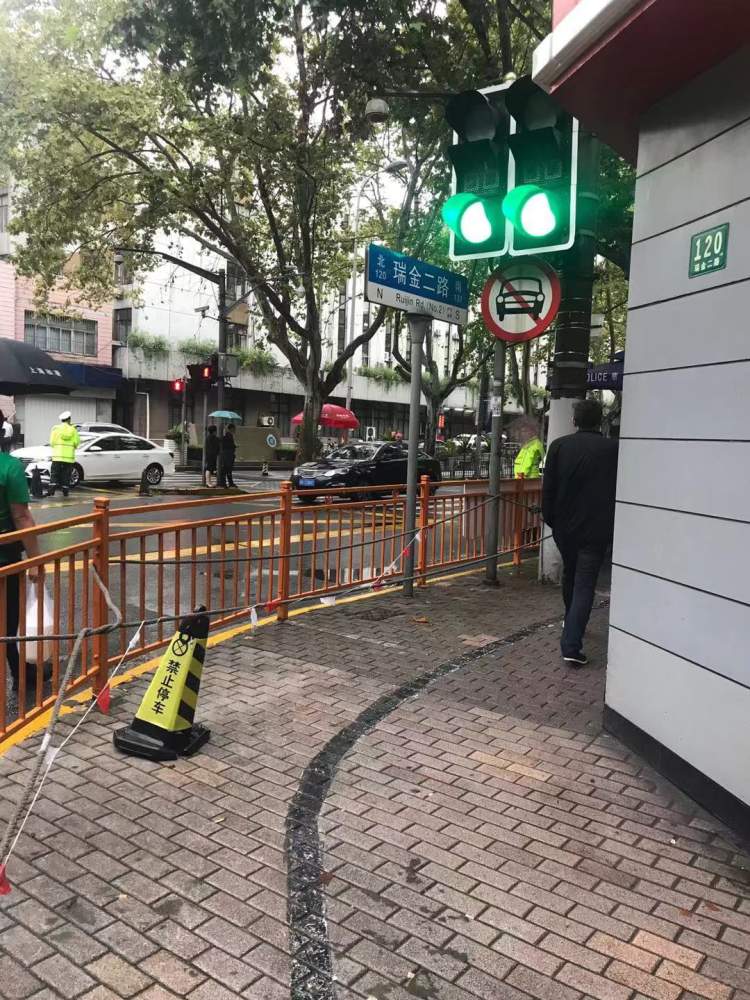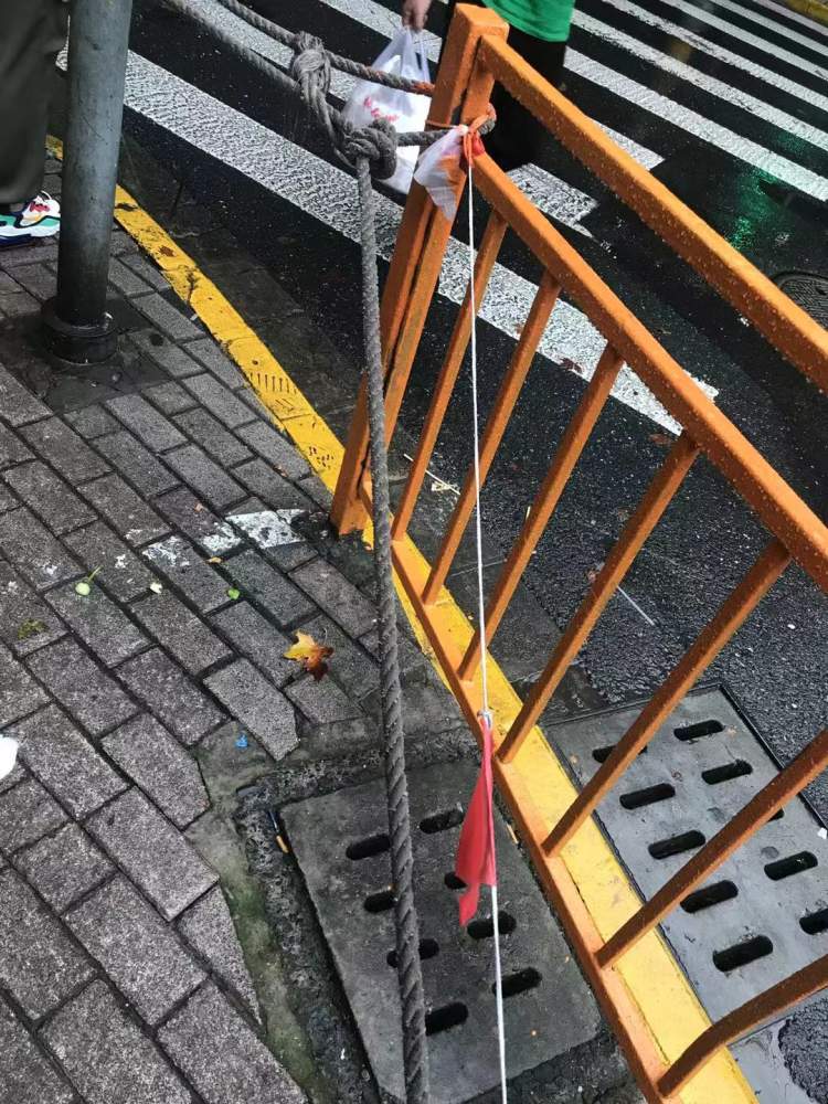 在永嘉路瑞金二路转角处,护栏前不久被刷上新油漆,为了防止行人不小心触碰,便用绳索拦住。这一堵一拦,便让很多人误以为“此路不通”。