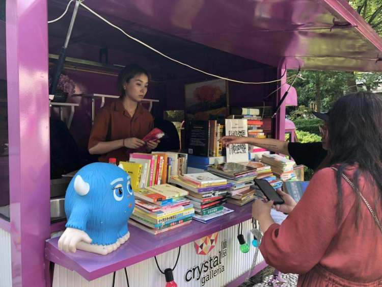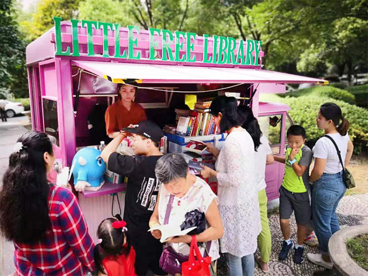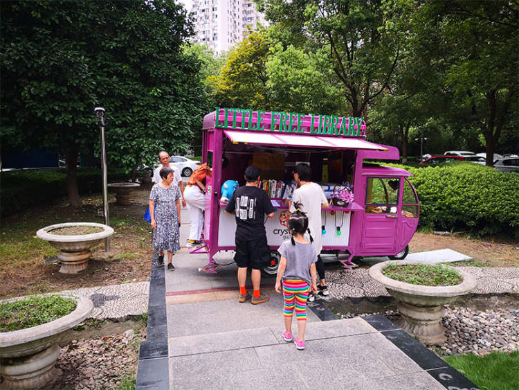 一辆粉红色的移动书屋开进了静安丽舍小区,引来了不少居民的驻足围观和热情参与,居民们纷纷拿出家中闲置的书籍,参与公益环保之行。