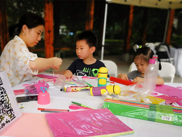 在活动现场,小朋友们除了以书换书外,在阅读区凉棚下看看儿童读物,或者跟着“小姐姐”学做工艺手工,在旧矿泉水瓶上贴上各种花色,做成环保“花瓶”,争做环保小卫士。最后,“小丑哥哥”会给每位小朋友一只长气球,以资鼓励。