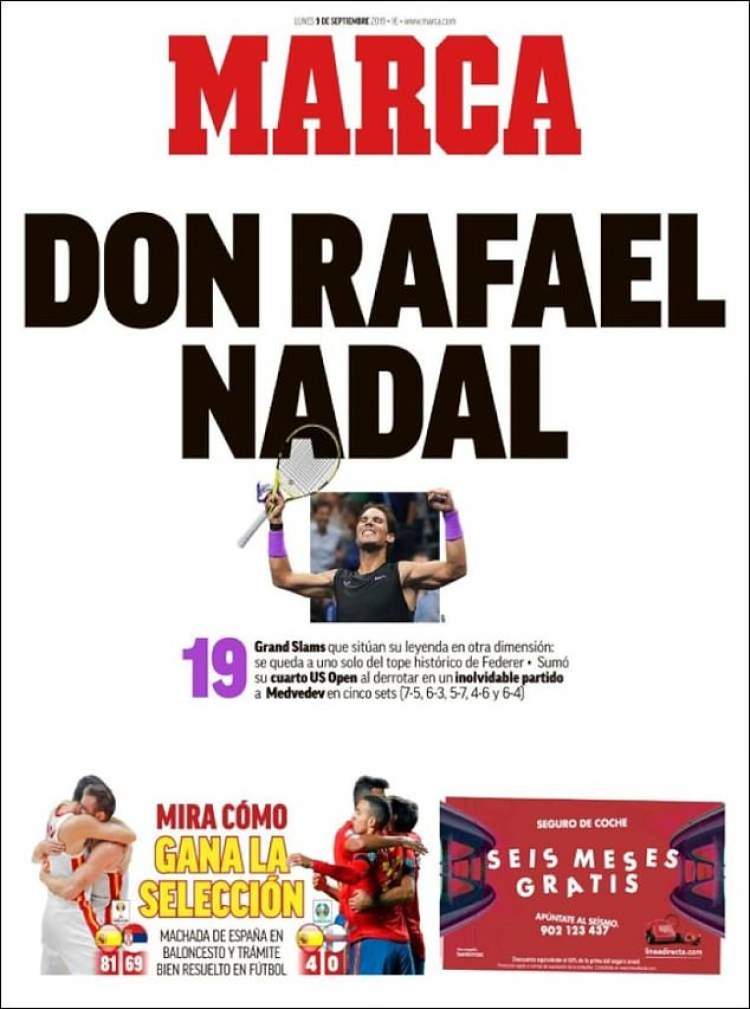其中,《阿斯报》用了一张纳达尔的照片,配上了他至今夺得19个大满贯头衔的历史时间表;《马卡报》则在封面写上巨大的“DON 拉法·纳达尔”。