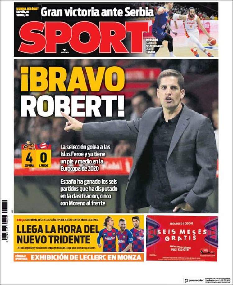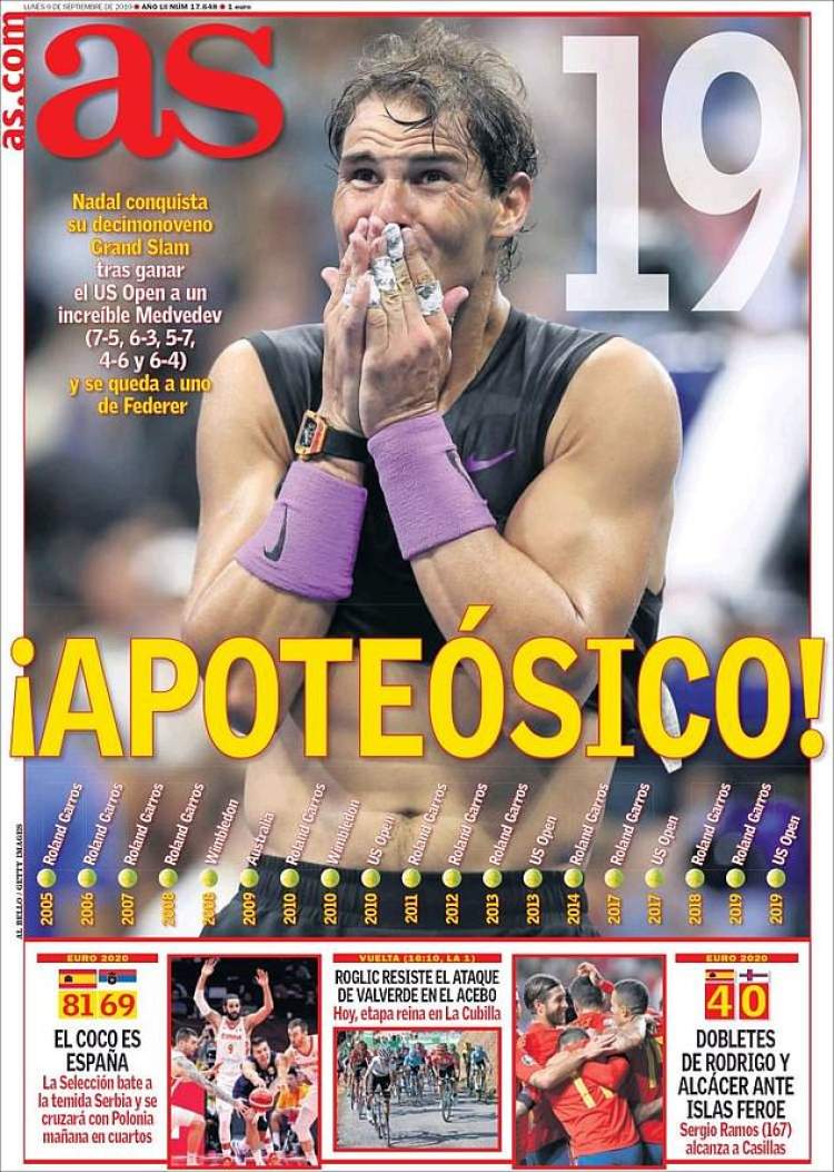 与之不同的是,西班牙的《每日体育报》(Sport)和《世界体育报》(Mundo Deportivo)的封面完全没把纳达尔当一回事,后者的封面大图则是聚焦于正在中国举办的男篮世界杯——西班牙81:69战胜塞尔维亚的比赛。
