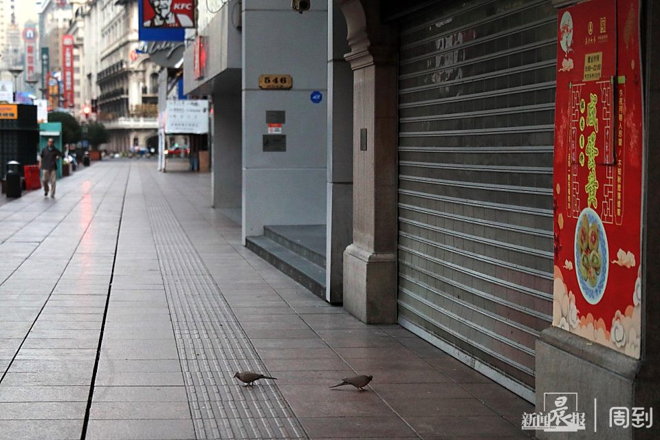 5点30分,静悄悄的步行街上,两只早起的鸟儿在觅食。