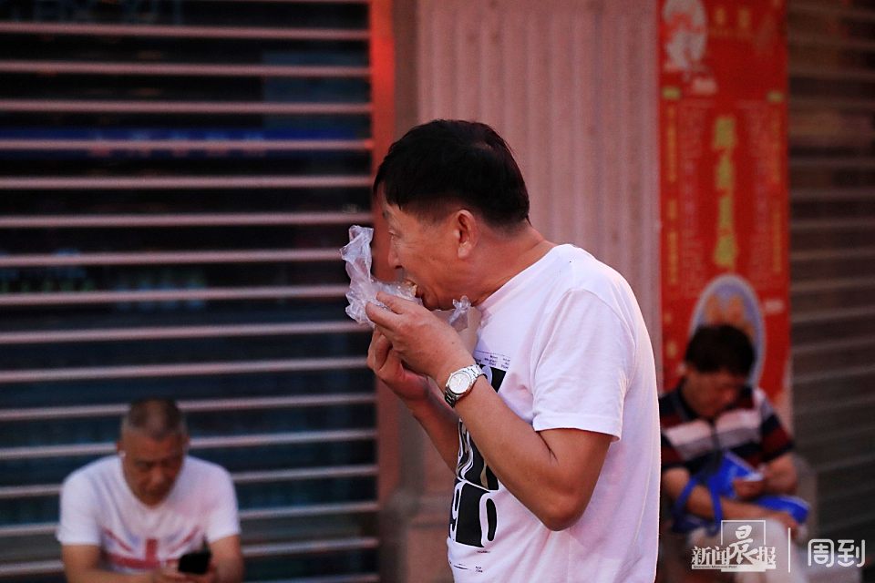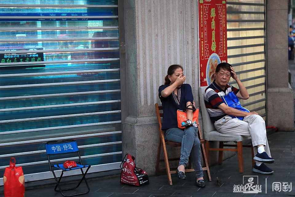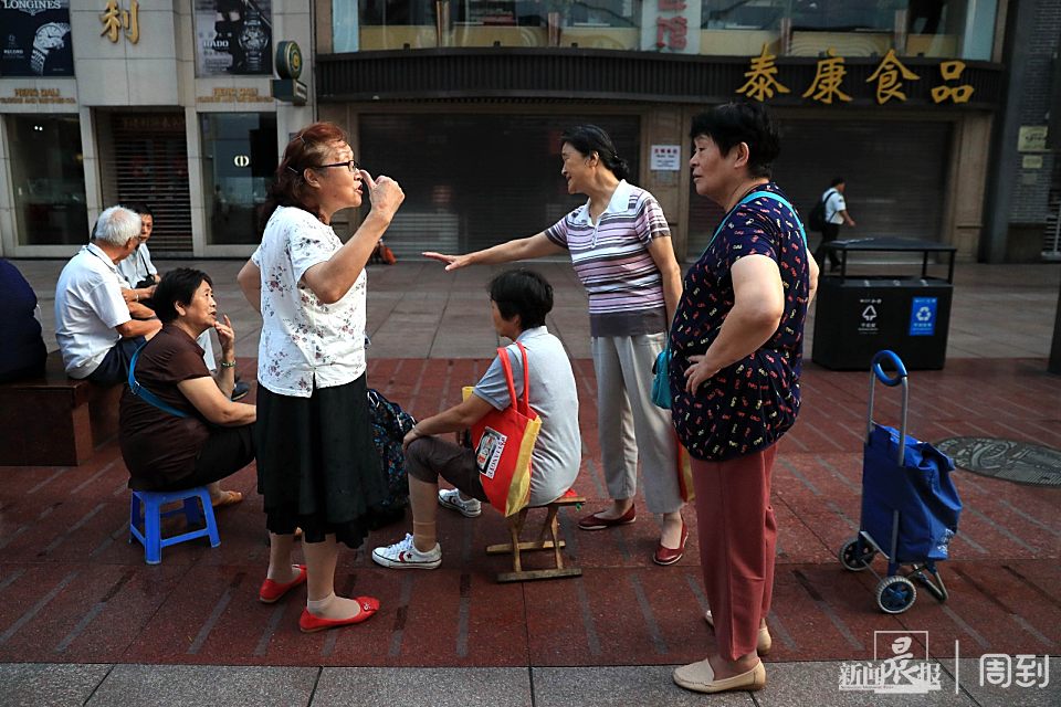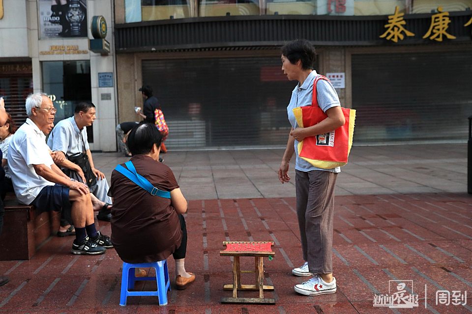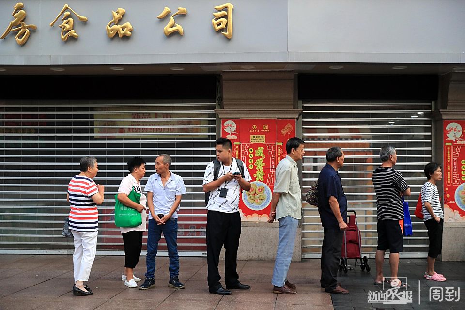 在步行街另一头的泰康食品商店门口,一位阿姨带着两只小板凳也早早地排着队。
