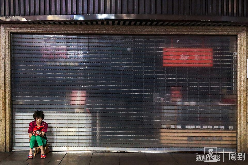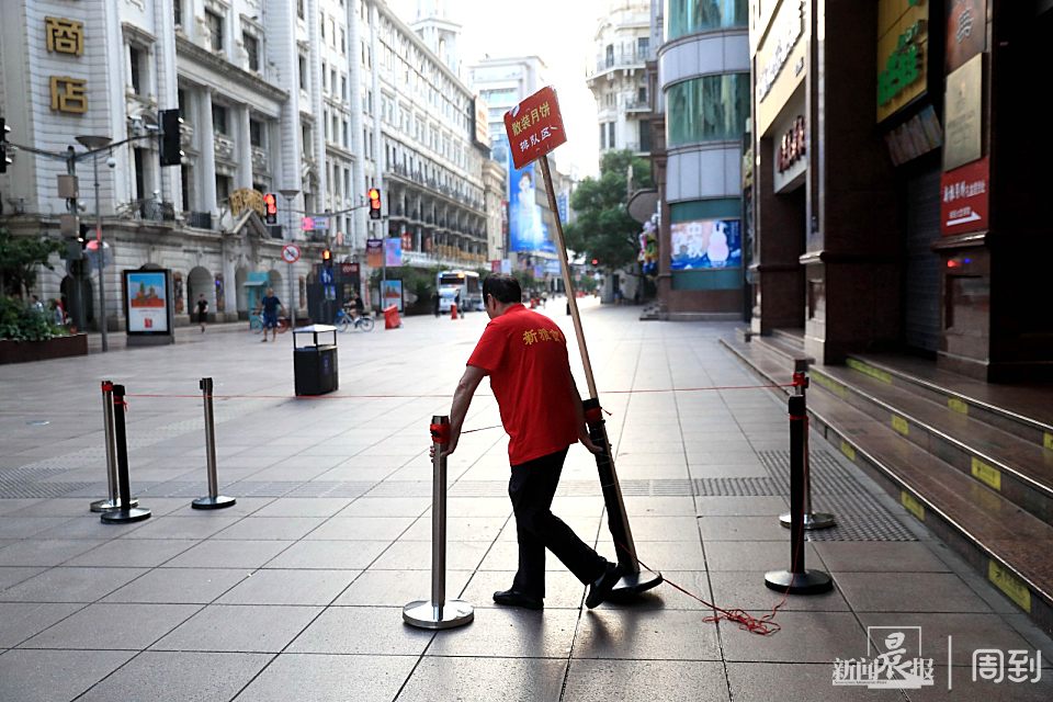 6点17分,老字号新雅的工作人员在门前摆放排队隔离栏。