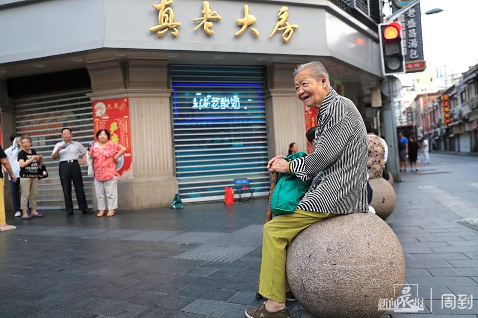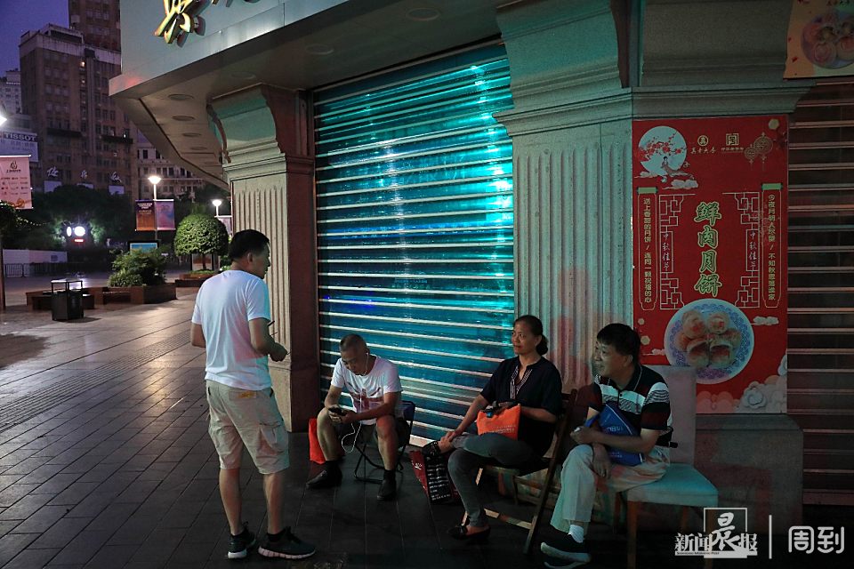 6点27分,一位手持拐杖的阿婆坐在石墩上休息,“每年中秋前会来真老大房买月饼送朋友和邻居。”阿婆说,她住在彭浦新村,坐第二班一号线地铁来的。