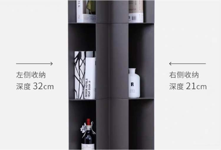 别看只是这么小的空间,其实也可以存放不少东西的。左侧和右侧的收纳深度分别为32cm和21cm,可以放书打造阅读角,也可以存放酒瓶、花器等生活小物。置物架共有30cm、40cm、53.5cm三种高度的模块。