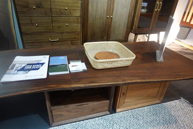 熹山工房这款茶几完全是DIY的产物。上面的木板是柚木,小号的可以当茶几,大号的可以当餐桌。