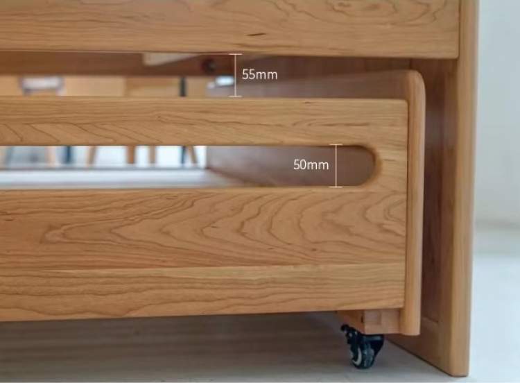 为了守护小朋友的“乐园”,这张床有诸多细节上的考量。比如说,上床床板和下床床栏到地面的高度都不高,降低独立睡觉的小孩上下床的风险;床底的滚轮为可锁万向轮+定向轮,在小孩子玩耍时提供保障。