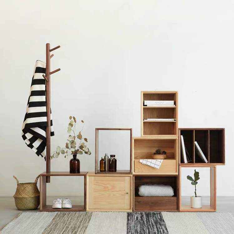 下方的格格柜本就是熹山工房的主打产品,你可以选择有柜门的、有抽屉的、没柜门的、黑胡桃木的、樱桃木的……进行自由搭配,获得更多储存空间。