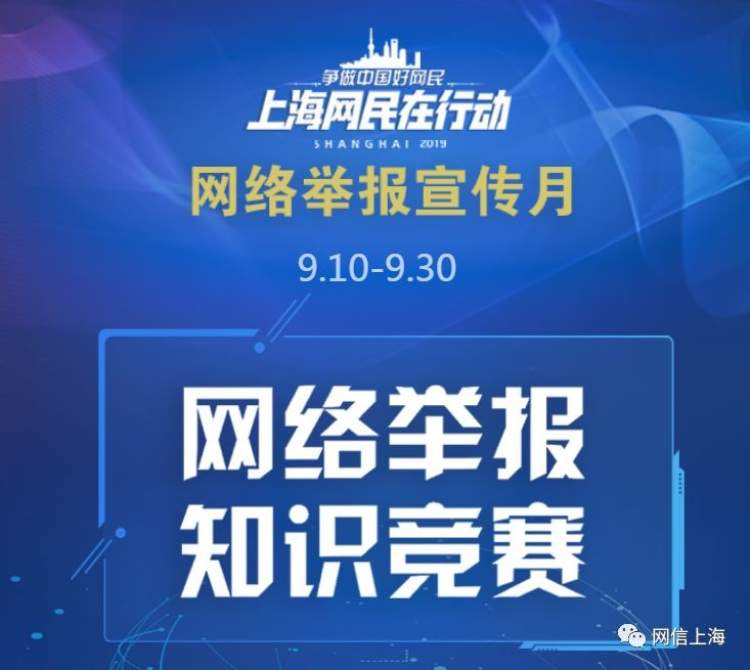 9月10日上午,2019年上海市网络举报宣传月启动式暨网络举报志愿者培训开班仪式在上海报业大厦2楼报告厅举行,网络举报知识竞赛也同日上线。该活动由上海市委网信办指导,新民晚报新民网和上海互联网新闻研究中心(上海市互联网违法和不良信息举报中心)主办。这也是2019年上海市“争做中国好网民 上海网民在行动”有关“网络乱象我举报”活动的重要组成部分。