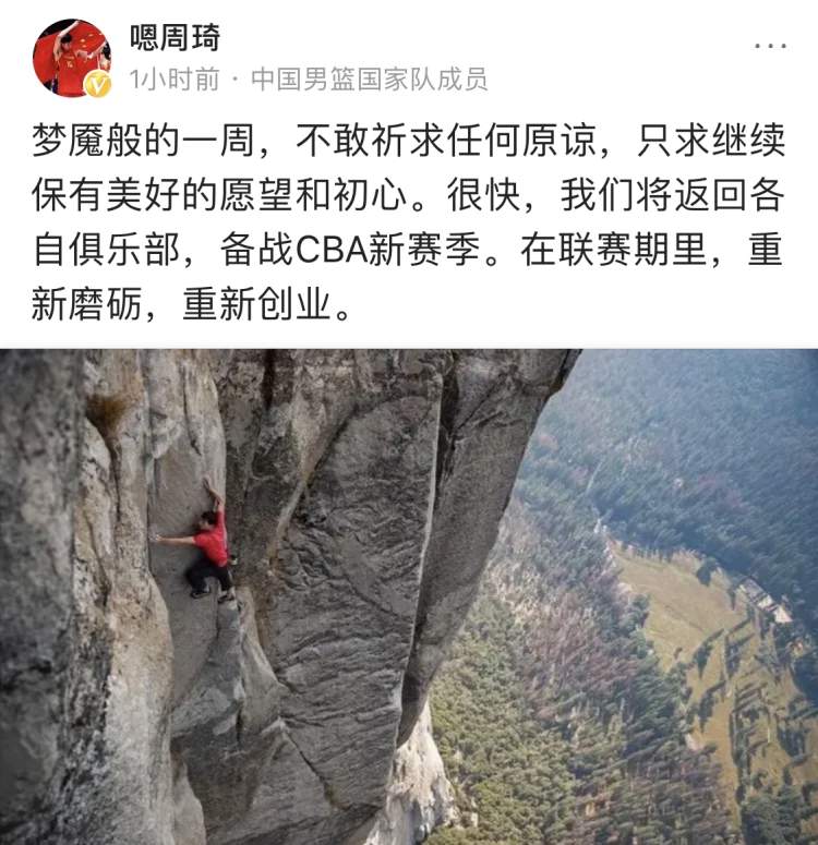 另一位深处舆论漩涡的主角周琦,今天下午首度发声,晒出一张攀岩的照片,写道:“梦魇般的一周,不敢祈求任何原谅,只求继续保有美好的愿望和初心。很快,我们将返回各自俱乐部,备战CBA新赛季。在联赛期里,重新磨砺,重新创业。”