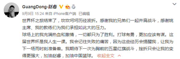 阿联的广东队友赵睿也总结了这趟世界杯之旅,感谢队友的一路同行,感谢姚主席、教练组为大家承担如此巨大的压力。