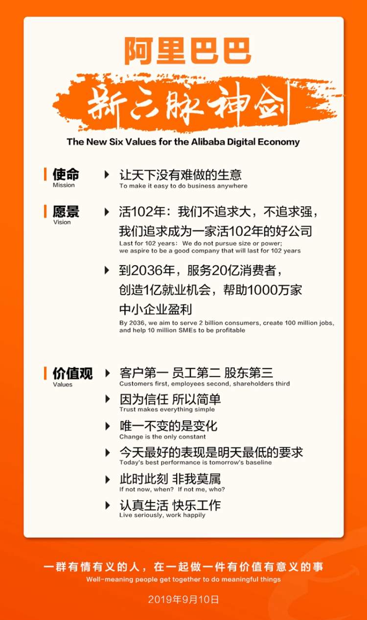 9月10日,阿里巴巴在成立20周年之际,宣布全面升级使命、愿景、价值观。