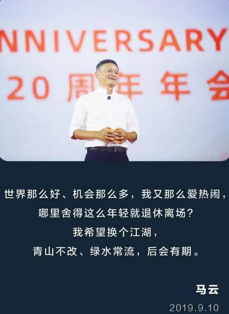 “过了今天晚上,我就要开启新的生活。”马云说,世界那么好,机会那么多,我又那么爱热闹,哪里舍得这么年轻就退了。“我希望换个江湖,青山不改,绿水长流,后会有期!”现场一阵欢呼。