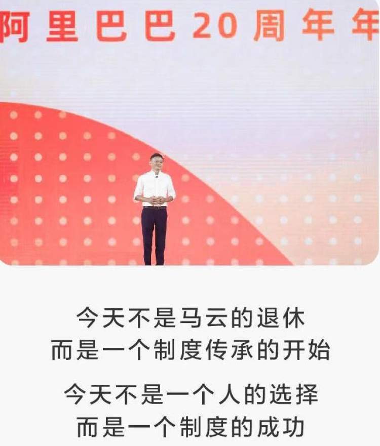 “今天不是马云的退休,而是一个制度传承的开始。”马云在他近20分钟的演讲中这样说,今天不是一个人的选择,而是一个制度的成功。