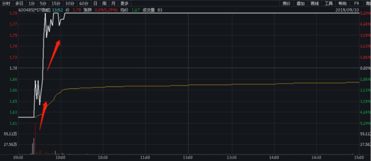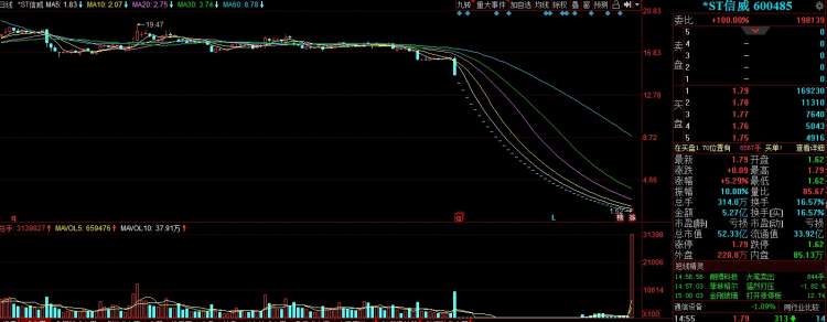 9月10日早盘,连续跌停的*ST信威(600485)在达到第43个跌停板后盘中打开跌停,随后大批量资金疯狂涌入,上演了一场快速的“地天板”行情。收盘,*ST信威股价报收1.79元/股,涨幅5.29%,接近17万手买单死死封在涨停板上,总市值为52.3亿元。全天成交5.27亿元,换手率16.57%。