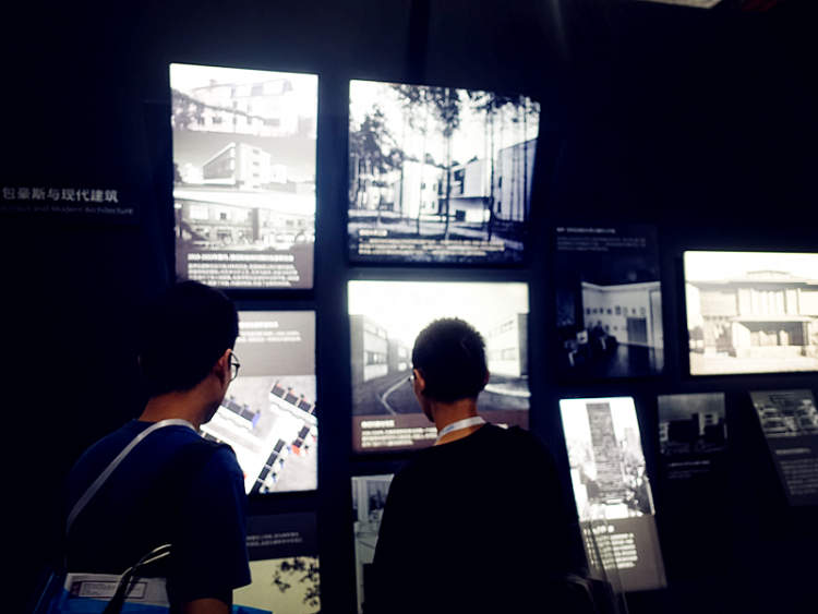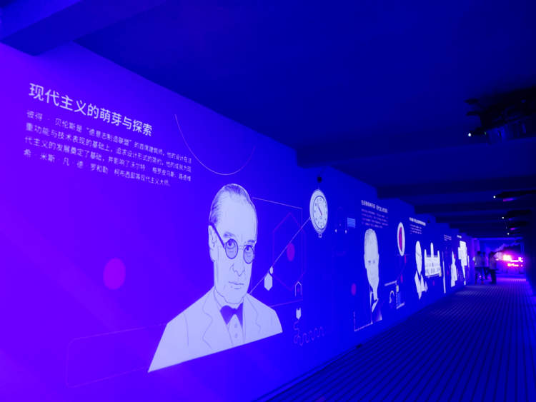 整整近40米长的时光隧道 一侧屏幕上倒叙呈现着数位百年来继承并发扬包豪斯精神的关键人物的理念和作品,彼得贝伦斯、瓦尔特•格罗皮乌斯、迪特•拉姆斯、贝聿铭、史蒂夫•乔布斯,只要用手触碰一下墙上的红色圆点,他们的妙语连珠和杰作就显现了! 在百年包豪斯的空间剧场,大师们的群像和代表作通过雾幕投影,3D全息影象说着故事。
