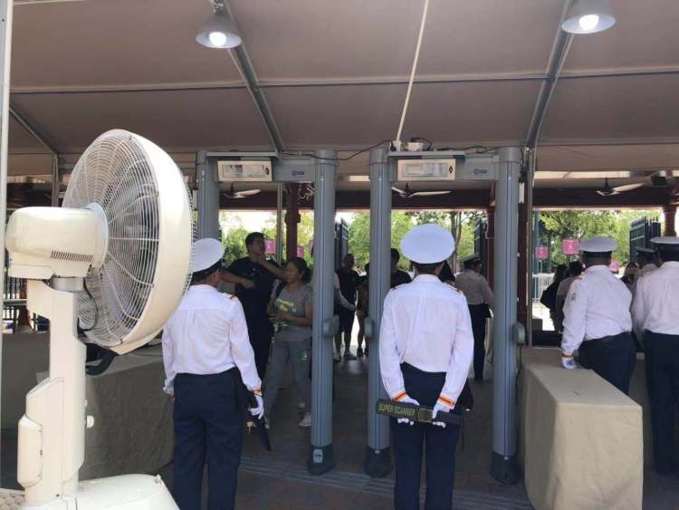 通过人工安检之后,游客进入下一步安检,即过安检门。此时,安检人员会协助游客将包放在一旁的桌子上,游客通过安检后,再取走自己的包。然后,就可以前往检票处检票入园了。