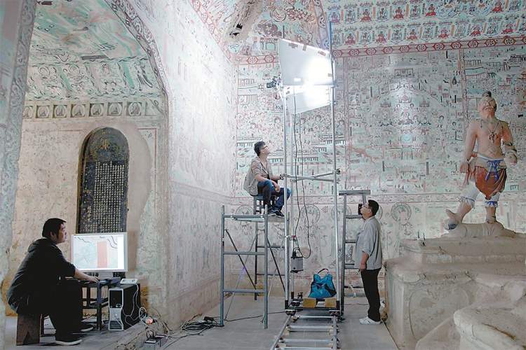 “数字敦煌”利用计算机数字化技术永久且高保真地保存敦煌壁画和彩塑的珍贵资料。30多年来,让一批敦煌艺术精品通过数字平台、数字展览、手机APP等途径走出敦煌。这是敦煌研究院莫高窟第146窟文物数字化保护项目工作现场。敦煌研究院供图