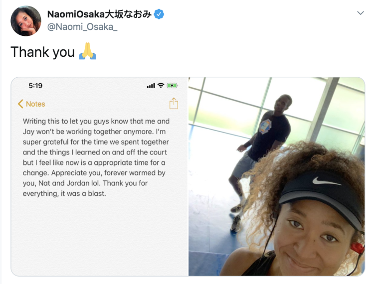“我非常感谢我们在一起的时间,以及我在球场内外所学到的东西,但我觉得现在是时候做出改变了,”大坂写道。