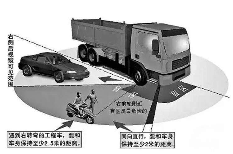 如果遇到右转弯的工程车等大型车,要和车身保持至少2.5米的距离,与大货车同向直行,则至少要和车身保持2米的距离。