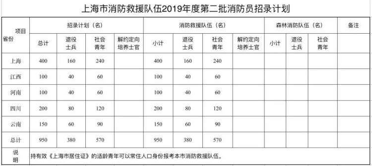 此次,上海市消防救援队伍计划面向社会招录消防员950名(上海市招录400名,江西省招录100名,河南省招录100名,四川省招录200名,云南省招录150名),其中定向招录退役士兵380名、公开招录社会青年570名。