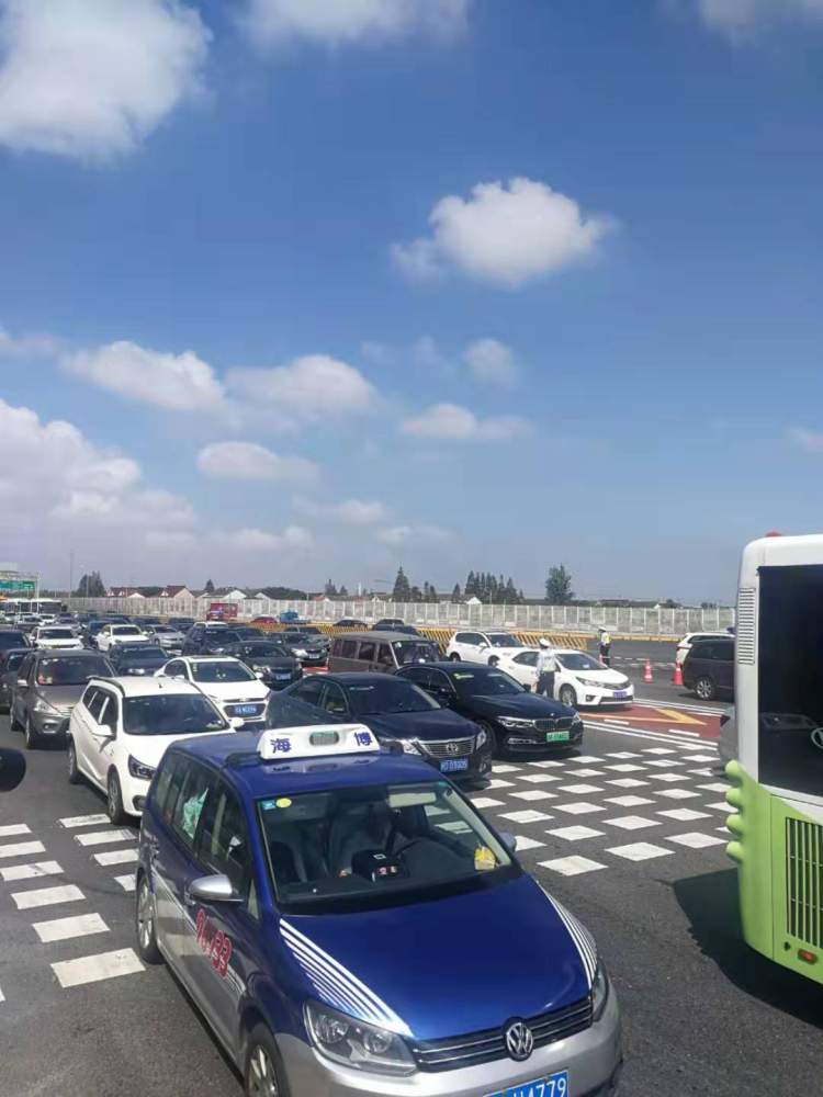 今天早晨9:00,在高东收费口,出城车流走走停停,沿五洲大道缓行,一直排到了申江路。
