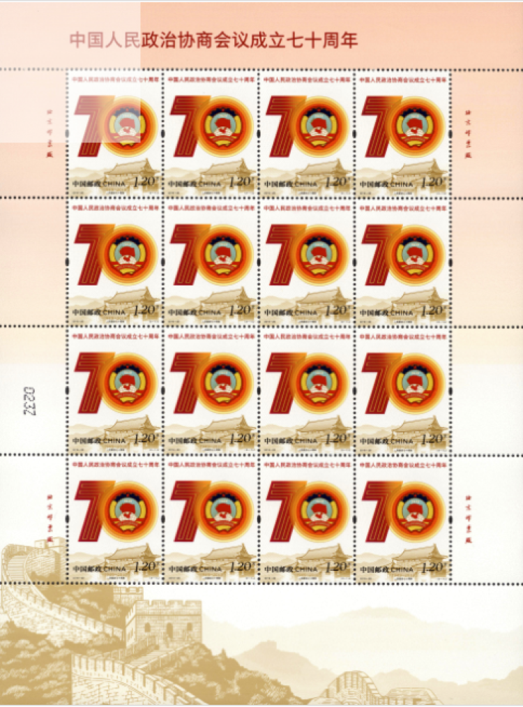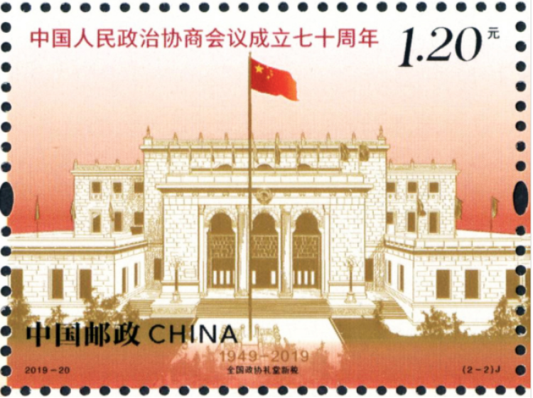 中国邮政定于2019年9月21日起,发行《中国人民政治协商会议成立七十周年》纪念邮票1套2枚,全套邮票面值为2.40元。