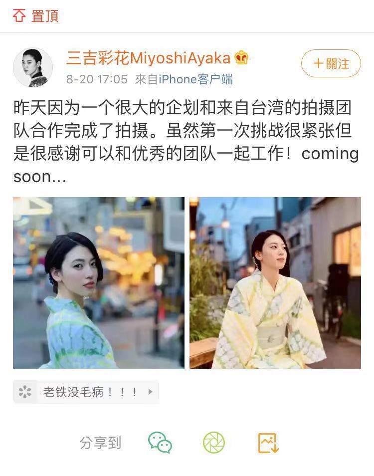 其实早在8月20日,三吉彩花就在微博上剧透了这次和周杰伦的合作↓