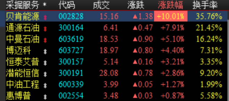 周二午后,油服概念股异动拉升,贝肯能源两连板,通源石油、中曼石油、博迈科大涨居前。一般在国际原油价格上涨的过程中,油气生产开采、油服设备、煤化工、替代能源等受益。
