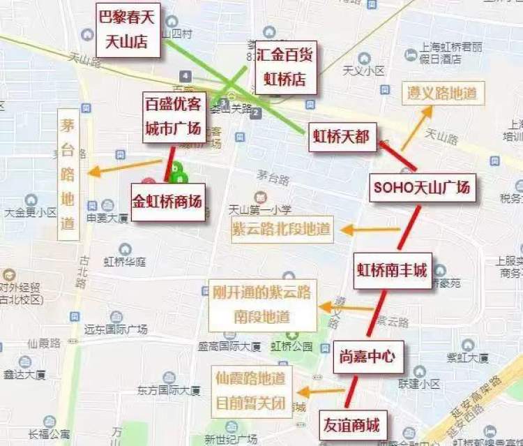 从2013年7月开工至今,虹桥天都、SOHO天山广场、虹桥南丰城、尚嘉中心以及友谊商城之间的四条人行地道已全部建成,不仅能够为逛街购物的市民提供地面、地下多元化的出行选择和更好的购物环境,也通过楼宇间的连通为附近商业体更好地吸引客流提供有力保障。四条地道包括: