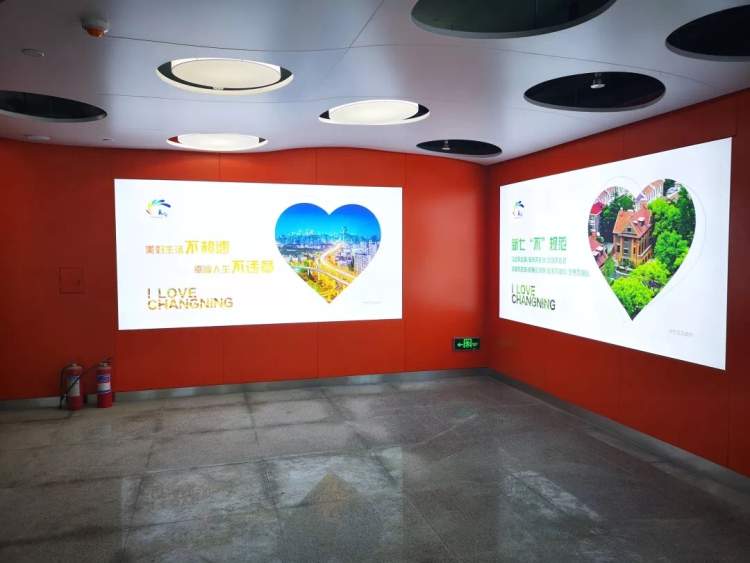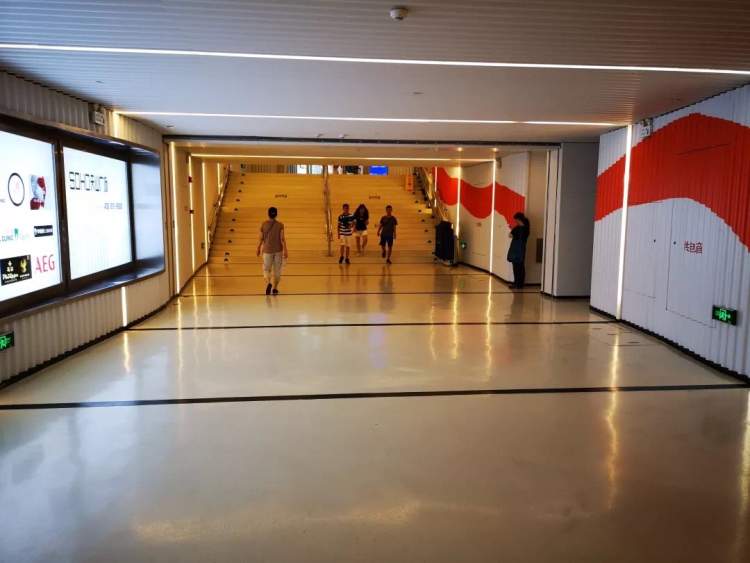 科技手段也被运用于地道施工中,地道顶部灯具采用LED防火软膜灯罩,使通道光源更加柔和温馨,天花板采用铝板,造型呼应地面,通过变形让空间更具动感,顶部以上做了喷黑处理,能够更好地隐藏设备管线。