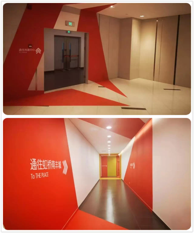 紫云路(虹桥南丰城-尚嘉中心)人行地道以“秋”为装饰主题,采取了橘红色的暖色调,地道总长度29.6米,主通道净宽8米,净高约2.6米。