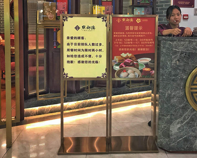 在用餐高峰期,点都德会在门口设置告示,提示消费者:“由于目前排队人数过多,用餐时限为2小时,如给您造成不便,十分抱歉。感谢您的光临!”服务员还会不时将牌子举过头顶,向正在排队的消费者展示。