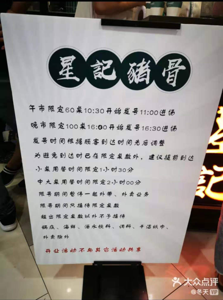 此外,有消费者爆料,刚刚开业不久澳门星记猪骨也推出了用餐时长建议。建议小桌用餐时间限定1小时30分,中大桌用餐时间限定2小时。和其他有用餐限时的热门餐饮店一样,在公示用餐时限的规则时,该店面的措辞选择使用了“建议”等不具备强制性意味的词汇。