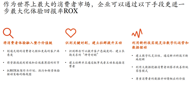 普华永道中国管理咨询合伙人赖奎百表示:“零售商正逐步跳出传统投资回报率的思考框架,开始采用以消费者为中心的体验回报率(Return On Experience,简称 ROX)策略。具体而言,零售商在逐步深入了解消费者的购物过程,筛选关键客户接触点和推动体验性消费的要素,同时加大投资直接影响消费互动及带动收益成效之相关领域。”
