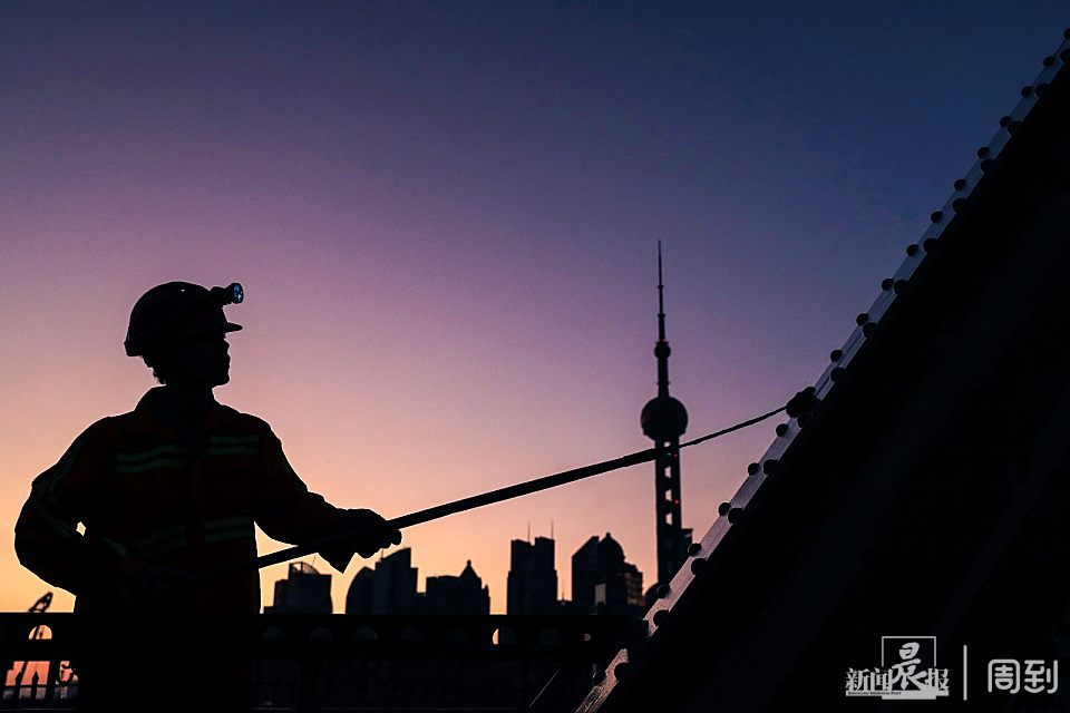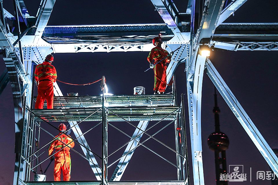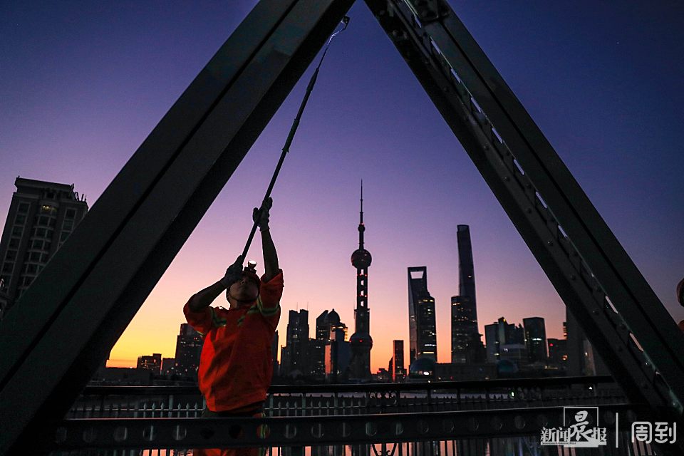 晨曦初露,天色微明,很多人还在熟睡,一群身着工装的外白渡桥养护工正挥汗如雨工作着,他们攀爬在钢桥上在进行景观灯的更换、桥身刷漆维护。披星戴月朝迎晨露,他们书写的是充满活力的劳动者形象。