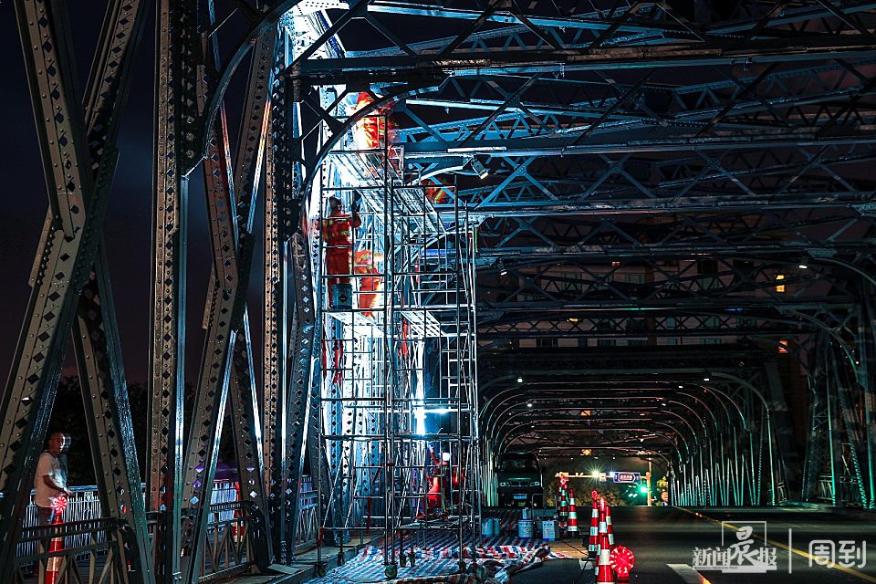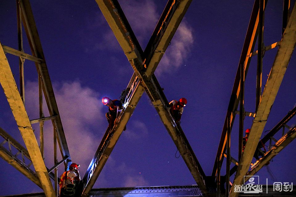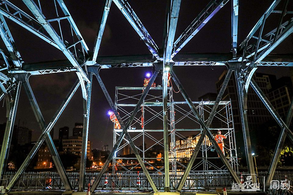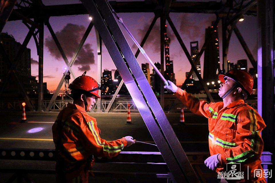 据了解,此次对外白渡桥体检“美颜”养护工作已进行了近半个月,为减少对交通的影响,施工时间选在每日凌晨0点到6点前。由于钢桥的特殊结构无法机械化作业,身绑安全带的养护工完全是手工作业。