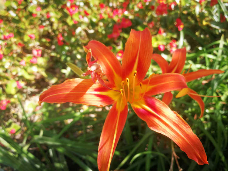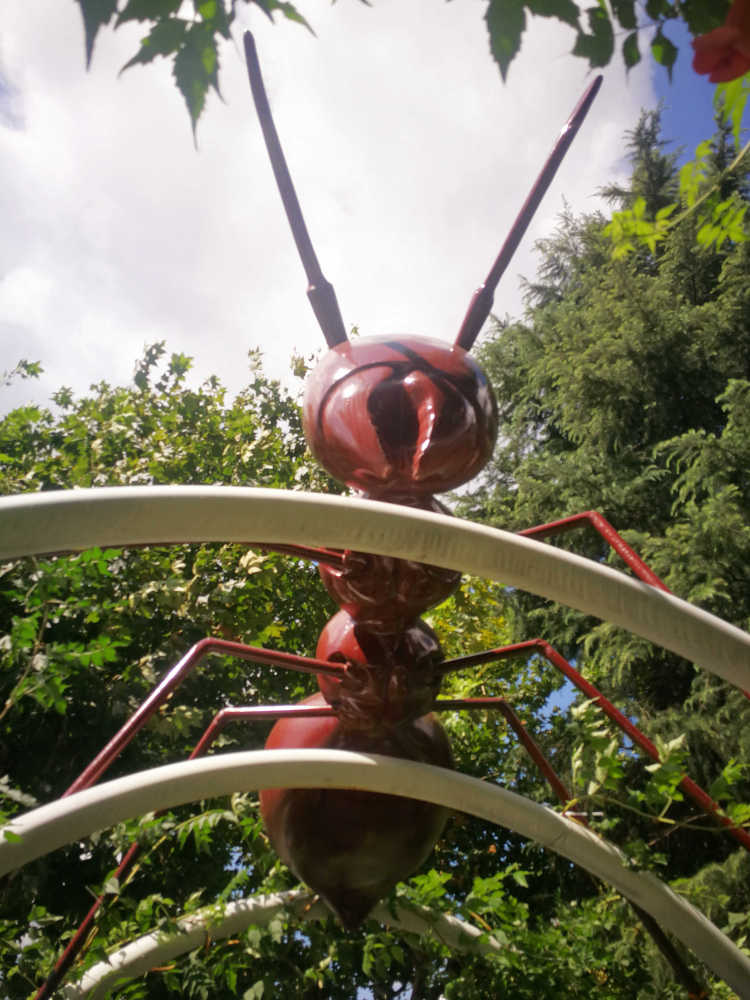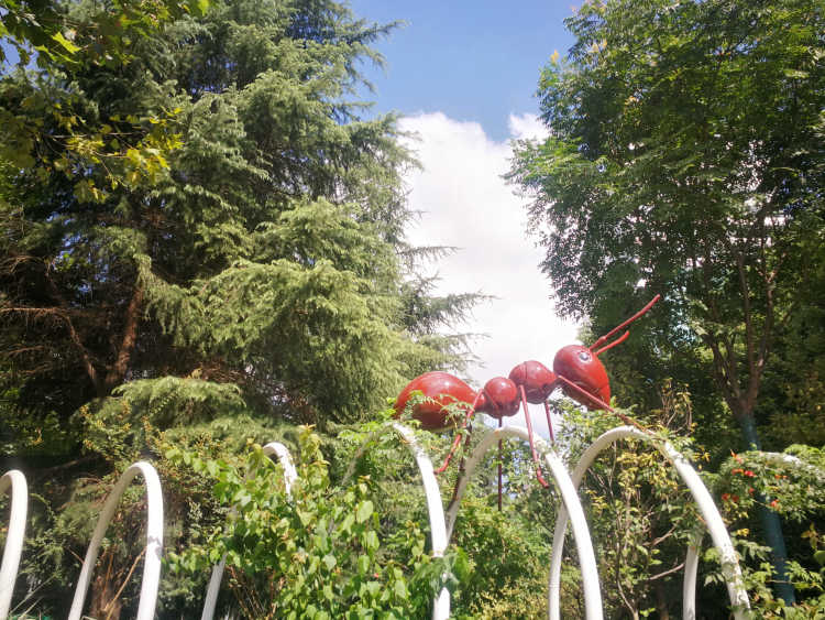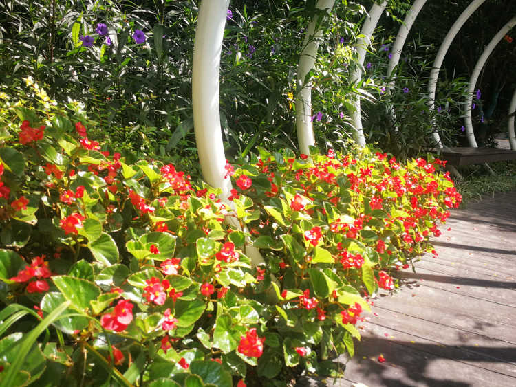 除了蚂蚁,还有各种花花草草围绕在拱形隧道左右,厚萼凌霄、海棠、蓝花草、美人蕉……在阳光下争奇斗艳、竞相绽放。