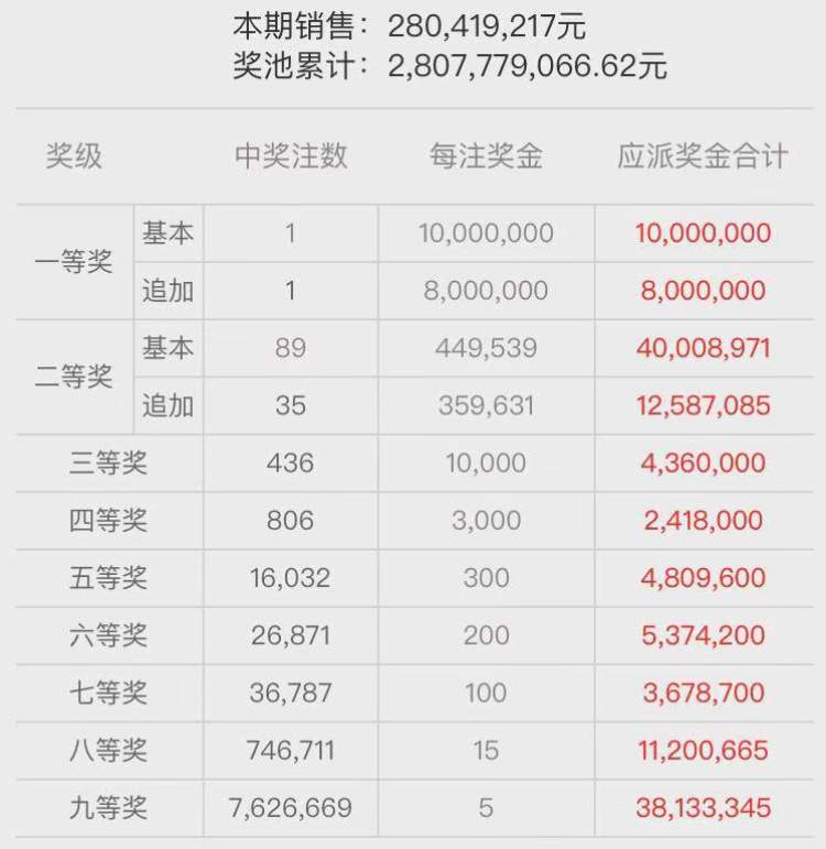 表中可见,本期二等奖中出89注,单注奖金44.95万元。其中35注为追加投注,每注多得奖金35.96万元。追加后,二等奖单注总奖金为80.91万元。