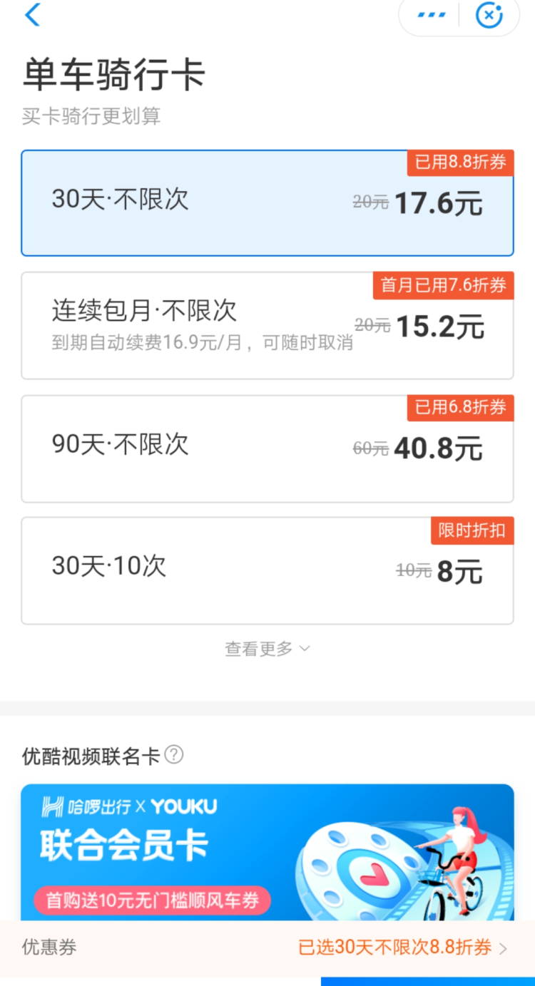 以哈啰单车为例,用户可以按需选择不同的月卡、季卡,在原先的价格上,随机还带有优惠。