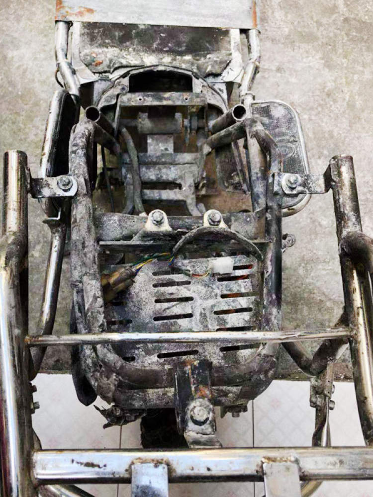 居民们见状后,纷纷拿来了楼道里的灭火器,从发现着火到最后扑灭,前后用了七八分钟的时间,用了6瓶灭火器才控制住了火情。经居民介绍,电瓶车原先停放的位置是在靠墙的角落,车主给车子接上线后就离开了,没过多久就发生了状况。